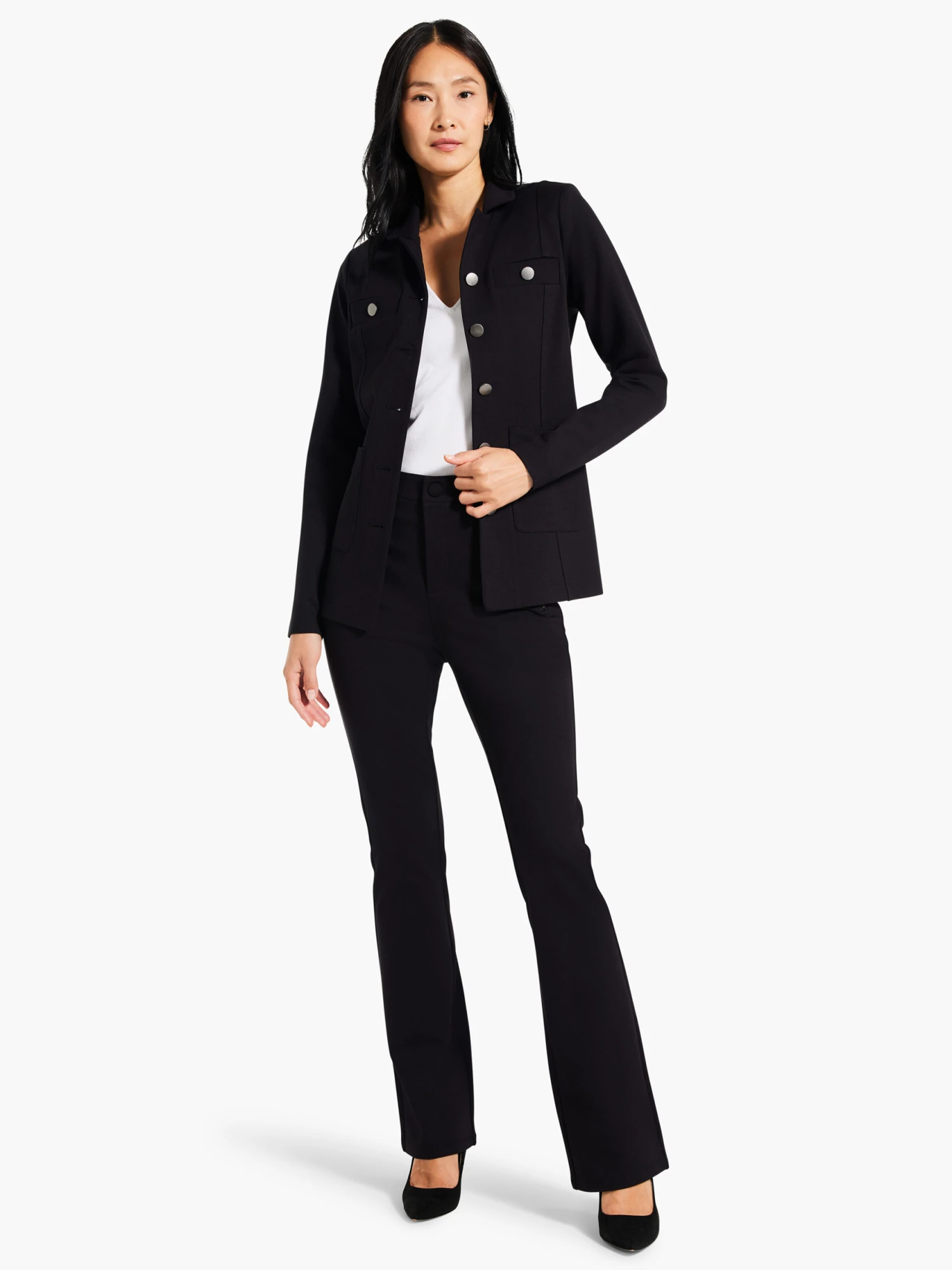 The double-knit feel and sophisticated look of Ponte Knit has never been this effortlessly easy. This every/any day style is full length, designed to sit just below the waist, and perfect for both work and you-time outfits. Slim through the hip and knee with a kicked out boot leg opening. Pull on with a faux fly, button closure, and zipper pockets with round pull details.