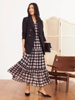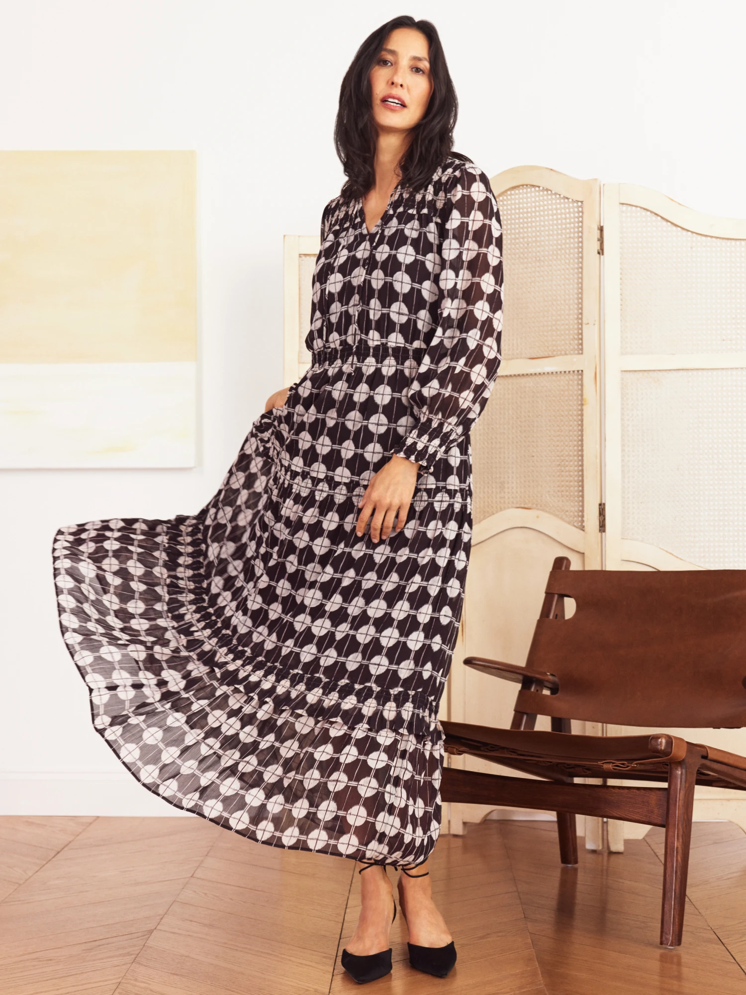 May your prints pop and may your silhouettes be breezy. Have it all and more with the Chiffon Dot dress, featuring textured Chiffon and a chic eye-catching pattern accentuated by the full-length maxi shape. We finished the look with pullover ease, a split neck collar, long sleeves for coverage, elastic cuffs on the sleeves, and a drapey feel with a little bit of added stretch.