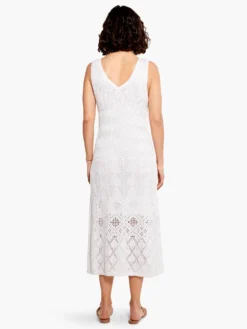 Ready to make a statement from head to toe? Pull on this textured, sleevless sheath and turn heads. The crochet effect is the star and shines even brighter in crisp white. Super cute under a colorful cardigan or blazer. Made with a lining so the gaps in the crochet work won’t show anything more than you intent. With pockets!