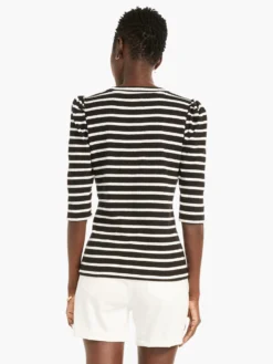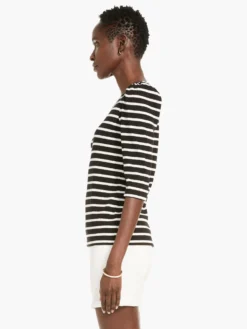 For the longest days of the year, or just the days you don’t want to end, a slight puckered texture complements the always on-trend stripes of this lightweight day-to-night top. Details include the placed stripe along the collar, a scoop neck, elbow sleeves, and a hem designed to sit at the hip. Made from a supremely comfortable cotton blend with a touch of spandex woven in to give it a welcome bit of extra stretch.
