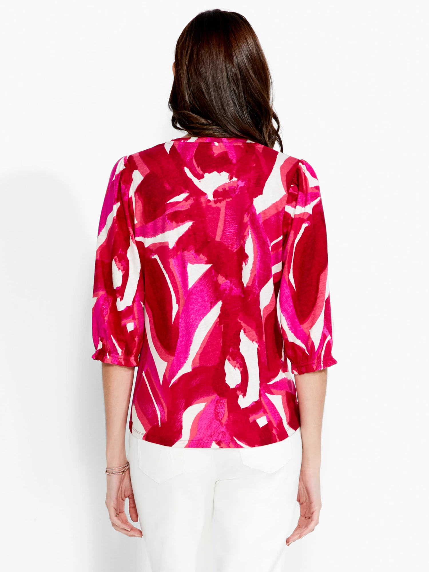 Step out in bloom. The pink and red of the abstract blossom print draw the eye, while the breathable linen blend construction and impeccable detailing finish the look and keep you comfortable all day long. The 3/4 elastic sleeves are versatile and feminine. Midweight and flowy, with a lined V-neck collar and a hem that’s designed to sit at the hip.