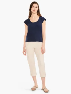 Even something with the ease of a T-shirt can make your day more stylish. The lettuce edge detailing at the cap sleeves adds interest to the classic T-shirt silhouette. We recommend wearing with denim to add a slight twist to the classic jeans and a tee look. The scoop neck adds more distinctive shape. Made from our cotton modal blend that gives a super soft feel with a great drape.