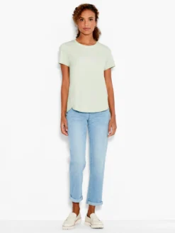It’s all about balancing the old with the new, the classic with the cutting edge. This tee features a soft, shirt tail shape at the bottom to give feminine touch to the classic tee shirt box shape. Stand apart with the color we like to call mineral sunray, but relish those classic tee features: the crewneck and standard short sleeve.