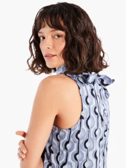 We simply can’t get enough of this pattern: geometric, organic, modern and classic somehow all rolled into one. We gave this anytime dress a sleeveless A-line silhouette, an elegant higher neck, a tie on the back, and a unique cut-in design at the shoulder. Made from 97% cotton with a touch of added stretch.